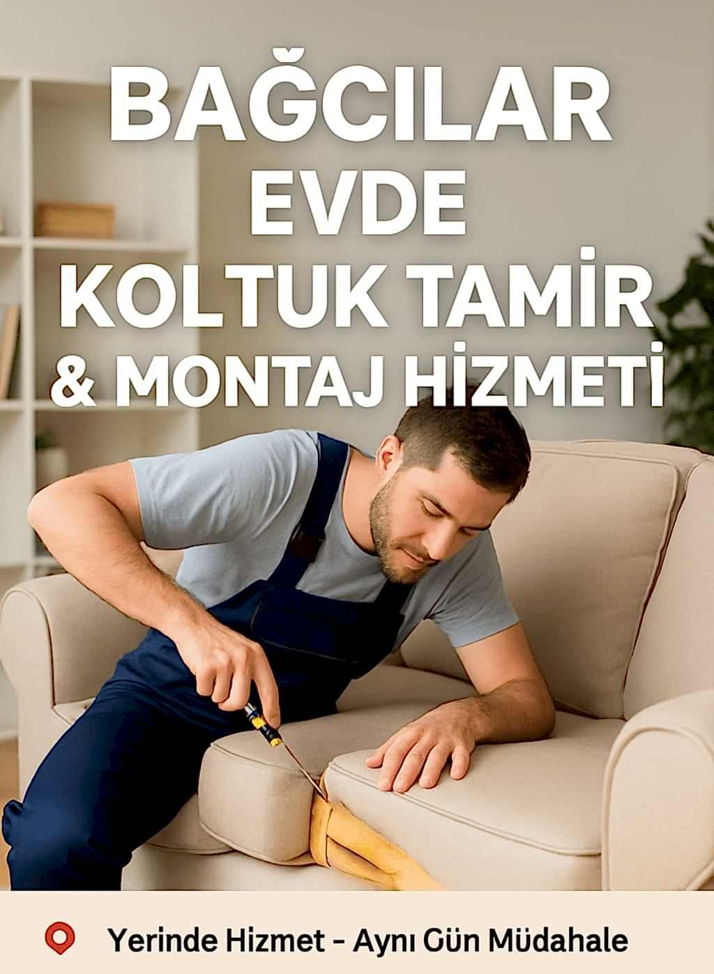 Bağcılar’da evinize kadar geliyor, koltuk tamiri, sünger değişimi, mekanizma onarımı ve mobilya montaj işlerinizi yerinde hızlıca çözüyoruz. Deneyimli ustalarımızla çekyat, kanepe, baza, sandalye gibi tüm oturma gruplarınızı ilk günkü konforuna…